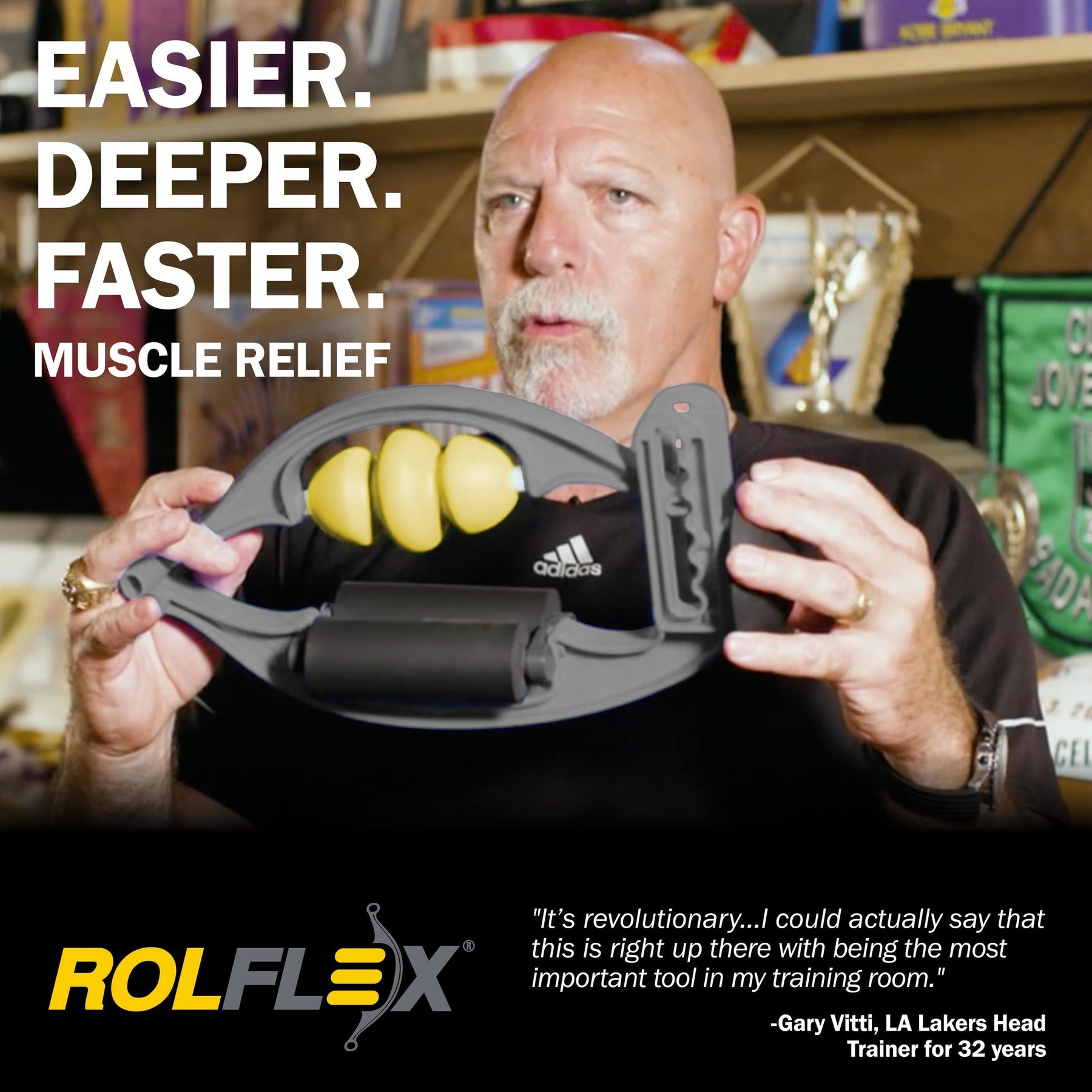 - The Rolflex Pro’s clam-shaped roller arms provide significant leverage, allowing users to clamp down and adjust the pressure to their liking or tolerance level. This is directly in contrast to foam rollers or lacrosse balls which are completely dependent on gravity.